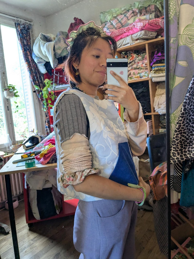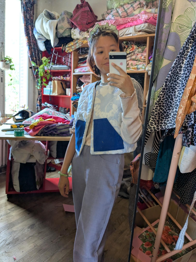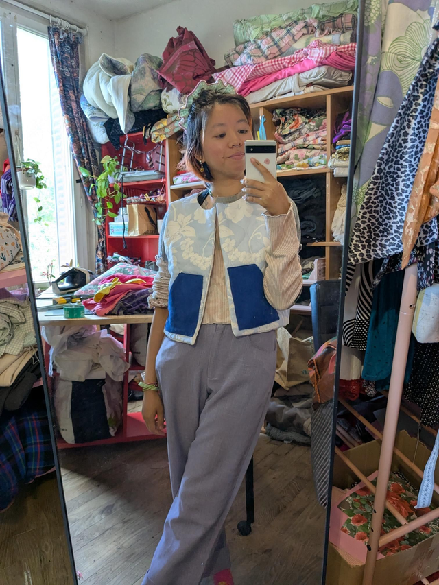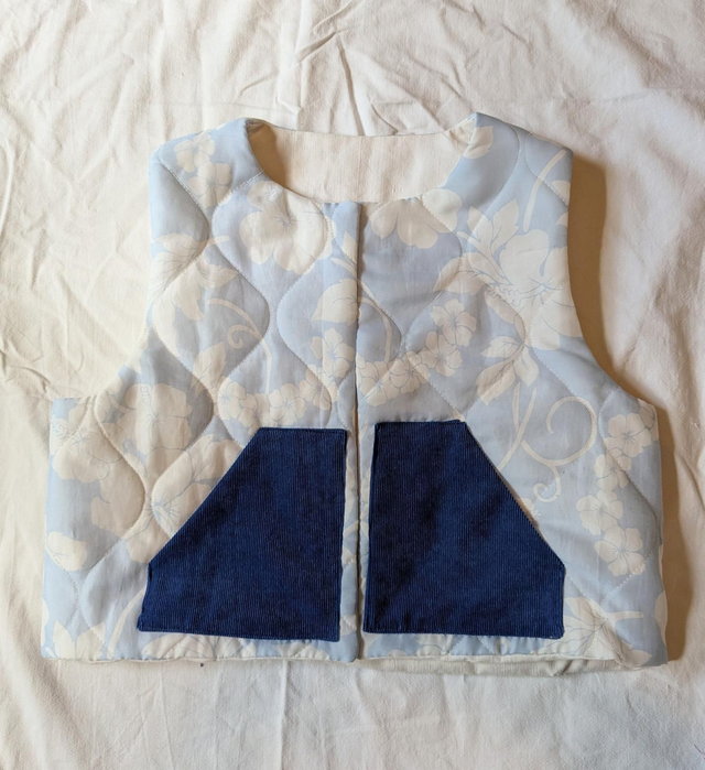 Veste sans manche avec une ancienne couverture. Motif fleuri bleu clair sur fond blanc. Deux poches plaquées sur le devant en velours côtelé bleu électrique.