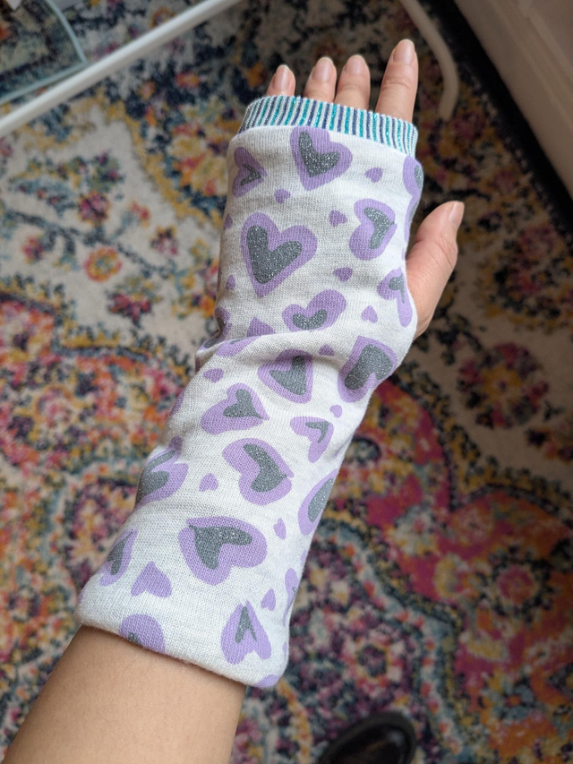 Mitaines en molleton gris avec des motifs coeurs violets. Bordure lurex bleu