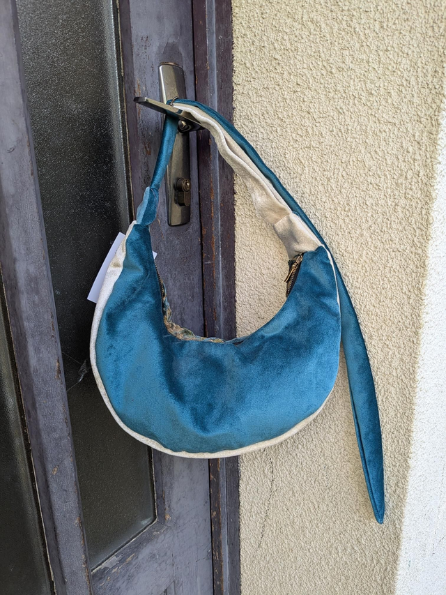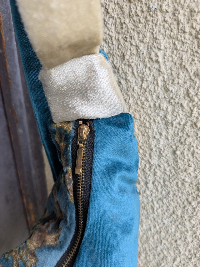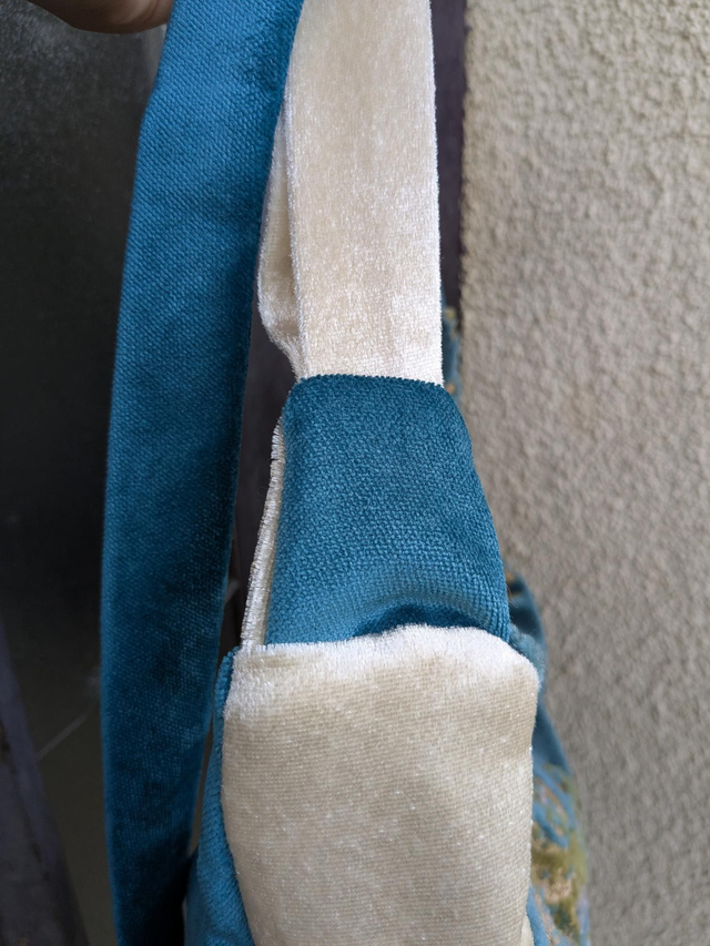 Tissus : Velours d'ameublement à motif fleuri bleu canard/turquoise foncé. Velours bleu canard. Velours blanc à reflets