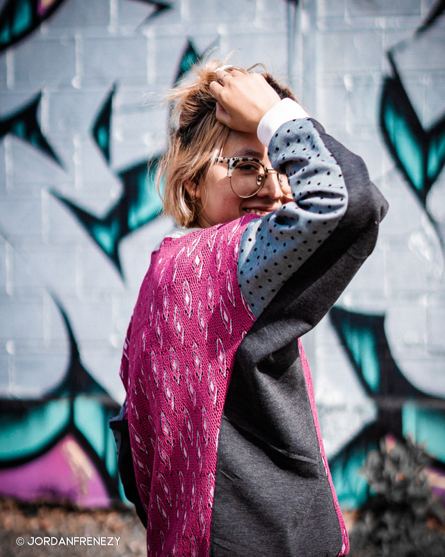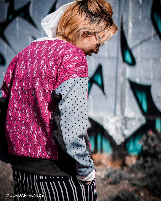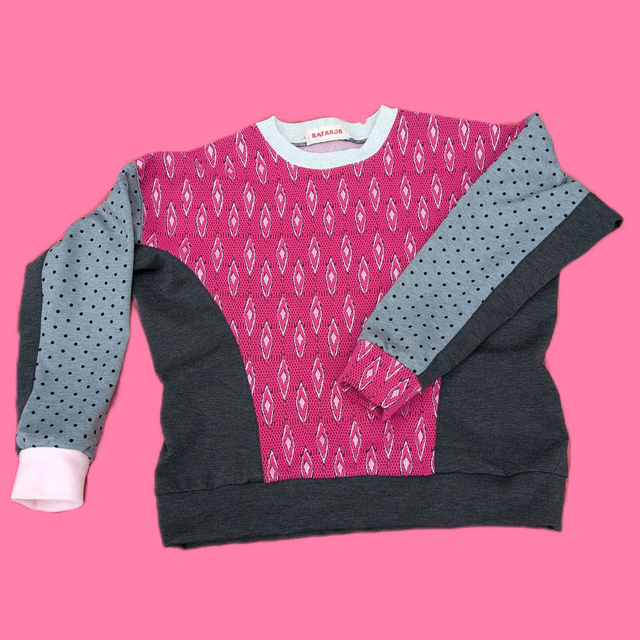 Ce sweat est une pièce unique réalisé avec molleton texturé rose, du molleton gris clair à pois et du molleton gris anthracite.