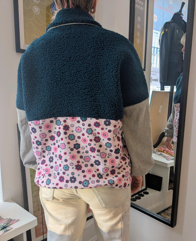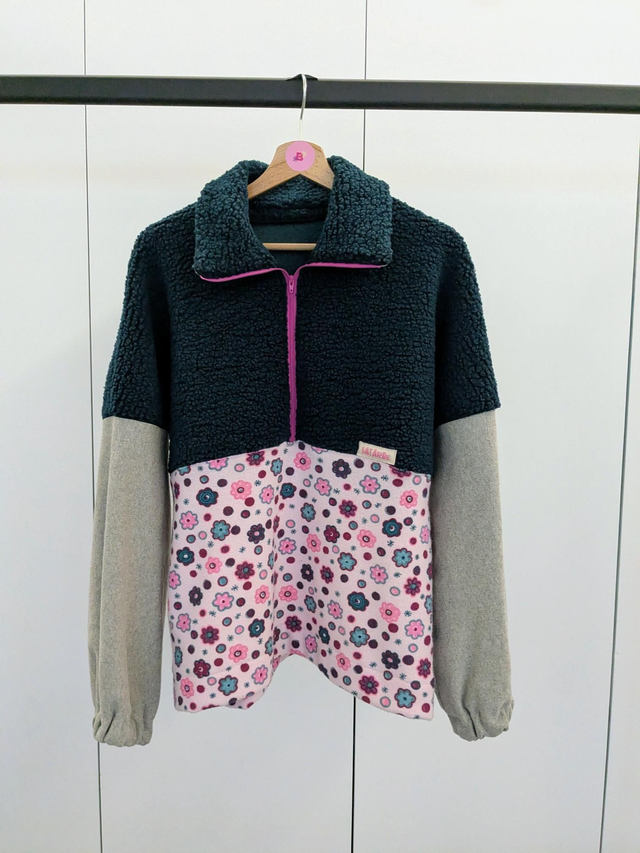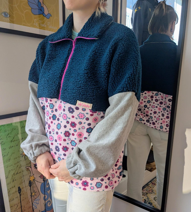 Sweat molleton tout doux rose à fleurs, moumoute bleu et molleton gratte gris.