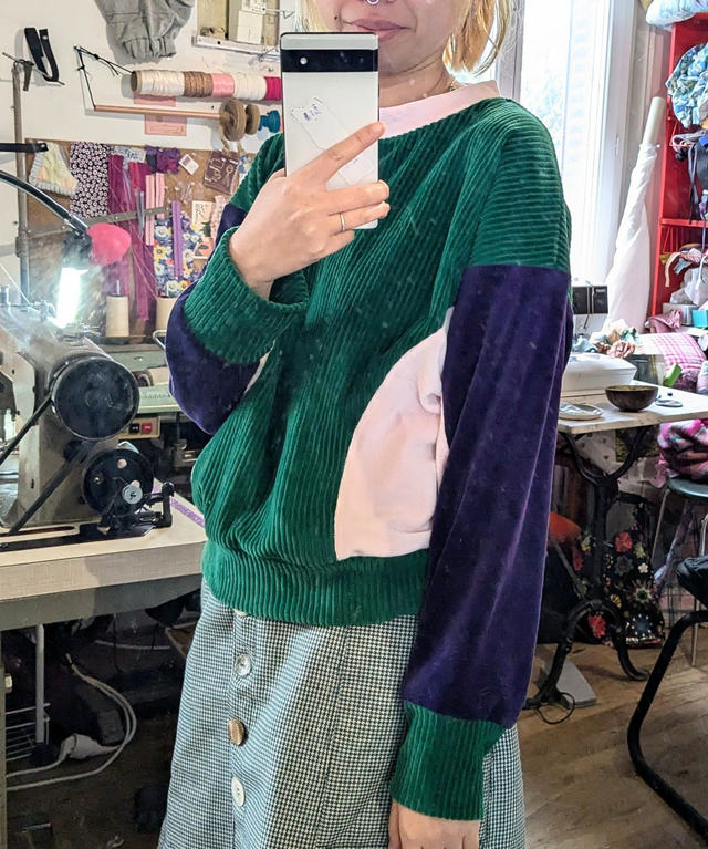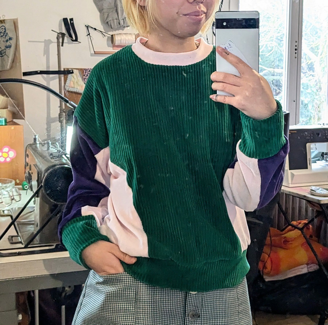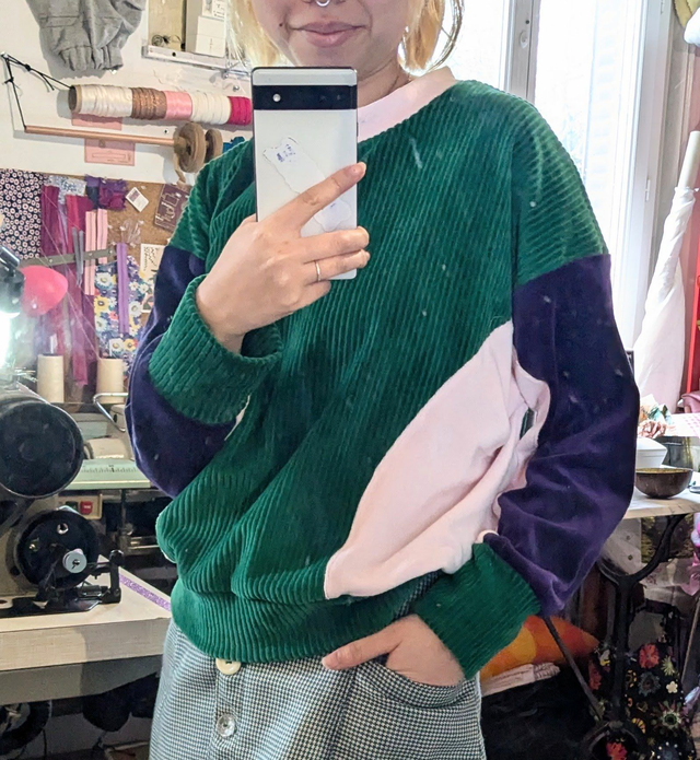 Ce sweat est réalisé avec du tissus sweat velours tout doux rose pale, violet foncé, et vert cotelé