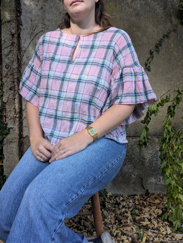 Top en voile de coton style froissé à carreaux de couleur rose, bleu et vert.