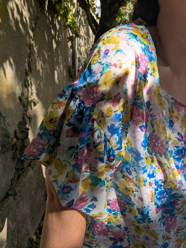 Top blouse à manches froncées en voile de polyester en partie transparent à motif fleuri bleu, jaune, rose.