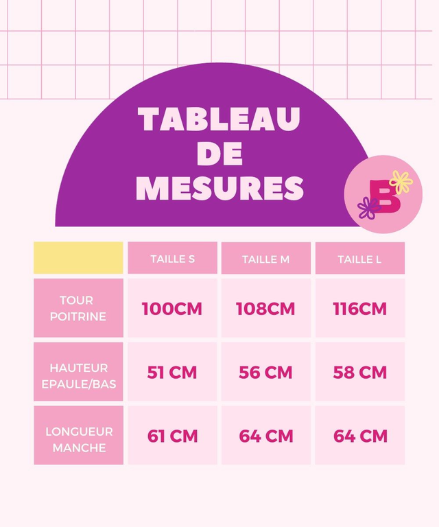 Vous trouverez sur la dernière photo le tableau de mesures. Vous pourrez ensuite choisir voter doublure selon les stocks disponibles.