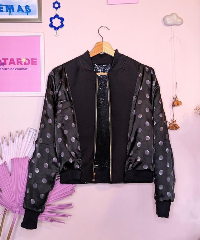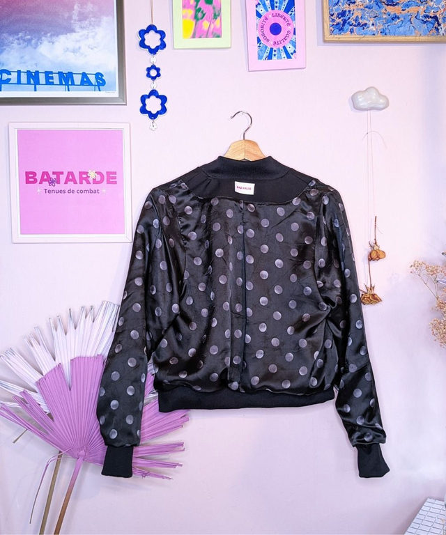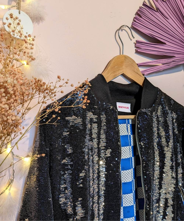 Les bombers sont réalisés dans mon atelier à Rennes dans un jolie tissus à sequins réversibles noirs et argentés. Il est resserré à la taille, les poignets et le col par un bord cote noir. Il possède deux poches zippées sur le devant. Il est fermé à l’avant par un zip noir et doré.